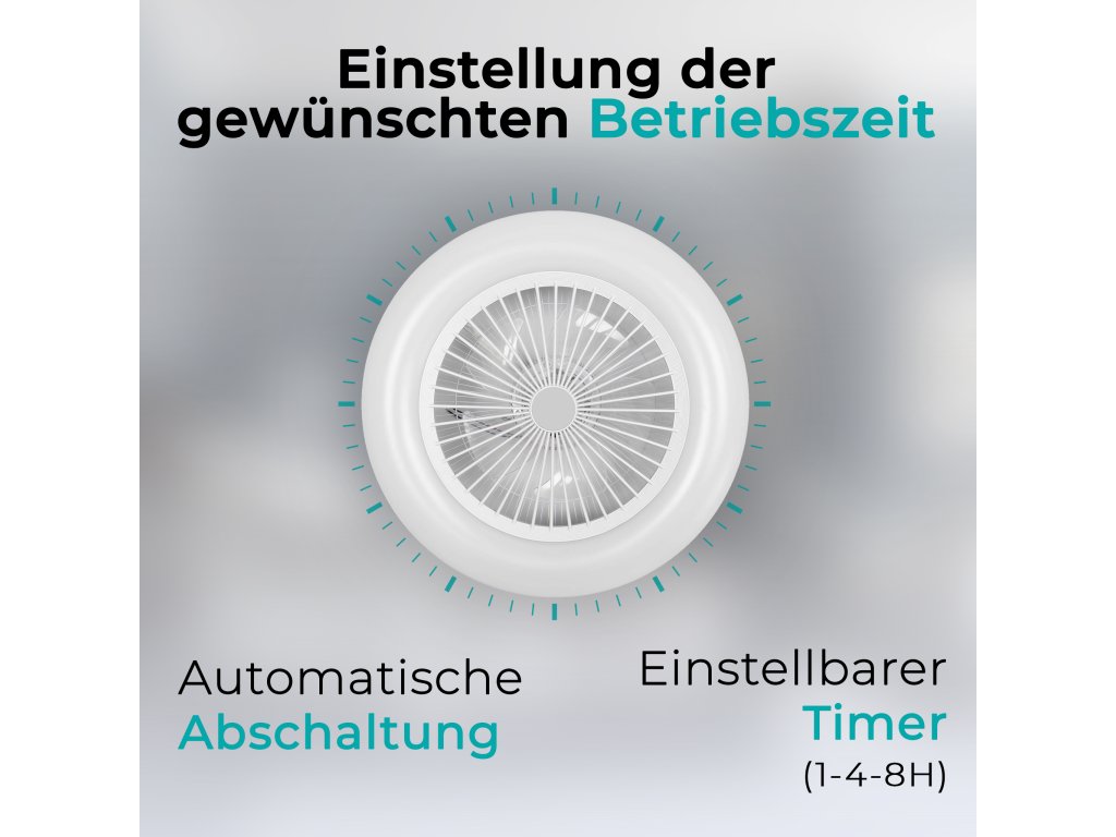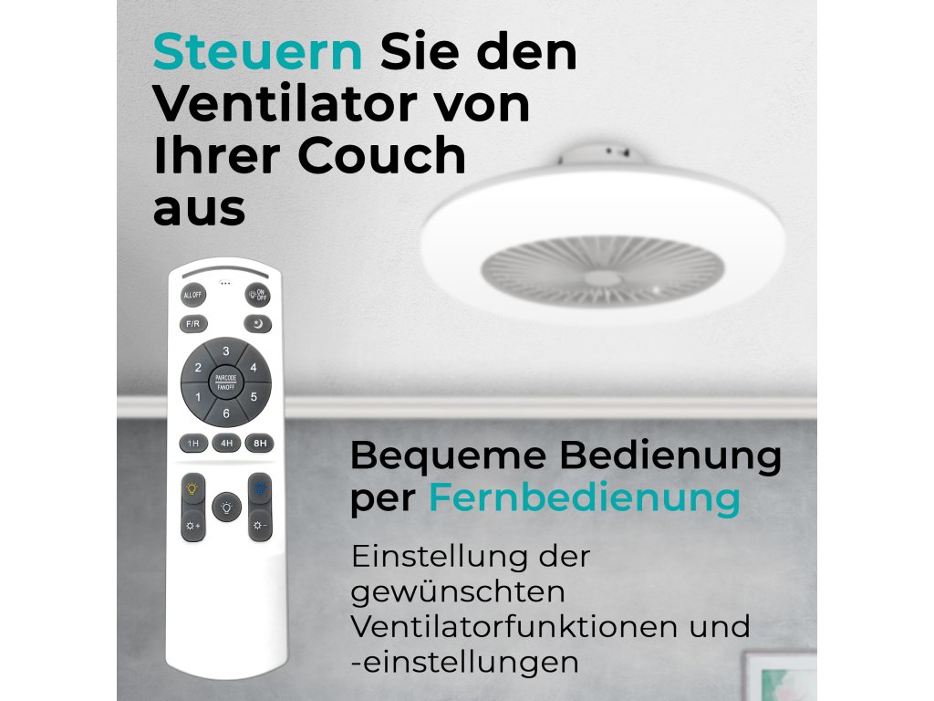 Der Ventilator ist weiß und kann praktisch überall verwendet werden, sei es in Arbeits- oder Wohnräumen. Zudem sind die Flügel durch einen robusten Ventilatorkörper geschützt und senken so das mögliche Verletzungsrisiko. Das Gerät wird einschließlich Fernbedienung geliefert.