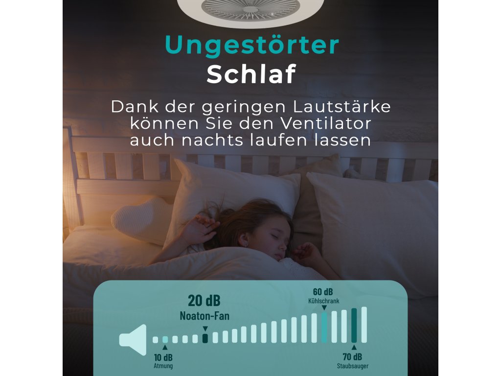 Der Noaton-Ventilator mit Leuchte ist nicht nur an heißen Sommertagen ein praktischer Helfer. Er verfügt über 5 Flügel (Material ABS), die in gleich 6 Geschwindigkeitsstufen angetrieben werden können, eine dimmbare Leuchte und eine Timer-Funktion. All dies ist in dem Gerät enthalten, das nicht nur wirtschaftlich (die maximale Aufnahmeleistung des Motors beträgt 20 W), sondern auch leicht ist und daher fast überall platziert werden kann (sogar an der Wand, also im Winkel von 90°).