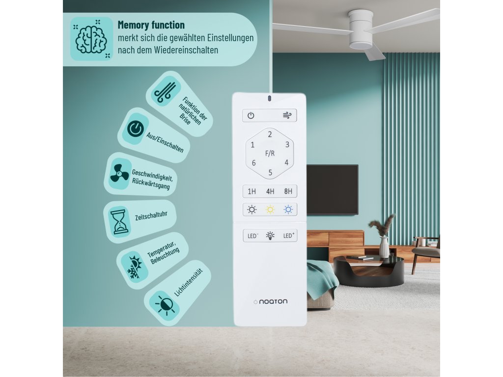 Wäre es nicht schön, Ihre bevorzugten Einstellungen zu haben, ohne erneut klicken zu müssen? Der Deckenventilator Zoya merkt sich Ihre letzten Einstellungen, auch wenn Sie den Ventilator ausschalten oder es zu einem Stromausfall kommt. Schalten Sie das Gerät einfach wieder ein und die gewählten Einstellungen werden automatisch wieder so übernommen, wie sie vor dem Ausschalten waren, egal ob es sich um die Lüftergeschwindigkeit oder den Lichtfarbton und die Lichtintensität handelt.