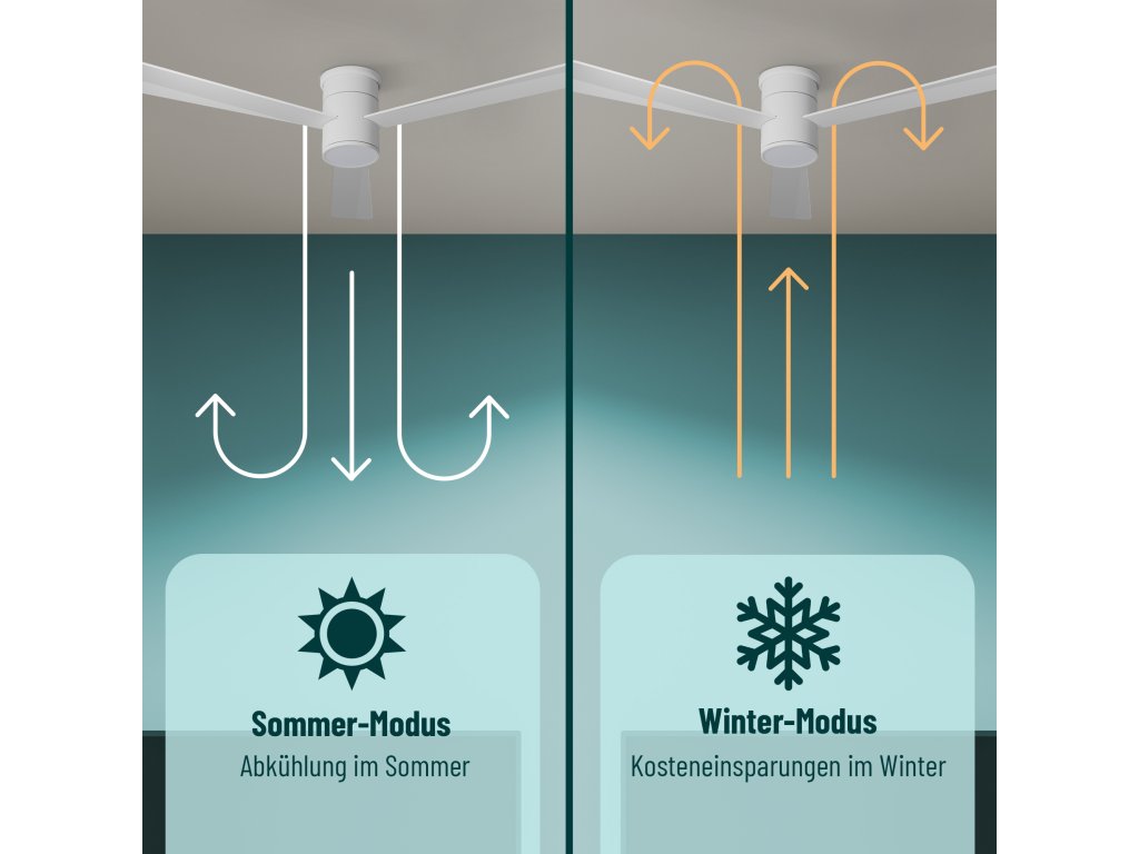Im Winter sollten Deckenventilatoren langsam im Uhrzeigersinn drehen. Dadurch wird kalte Luft von unten angesaugt und gleichzeitig aufsteigende warme Luft an den Wänden entlang Richtung Boden gedrückt. Durch sanfte Zirkulation werden die Luftschichten vermischt und die Temperatur im gesamten Raum ausgeglichen, jedoch ohne Zugluft. Stellen Sie die Heizung also statt auf 24 °C auf 18 °C ein und sparen Sie bis zu 20 % Heizkosten.