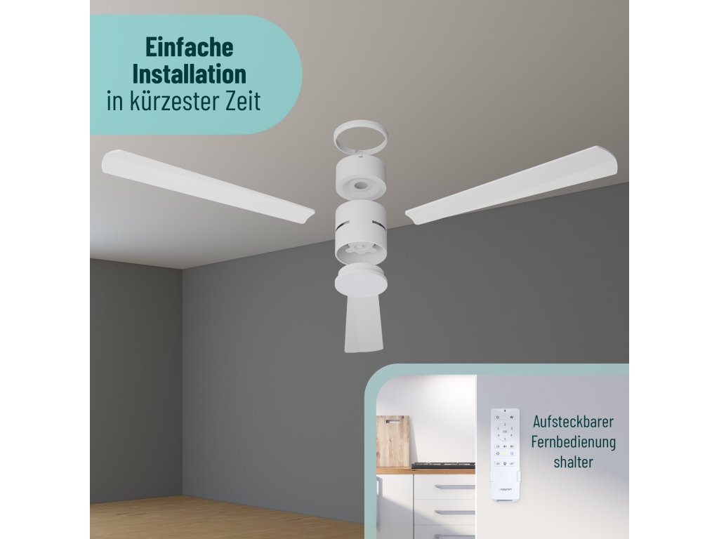 Dabei befestigen Sie den Ventilator mit Schrauben und Dübeln an der Decke (oder Wand) und schließen ihn direkt an das hauseigene Stromnetz an. Dadurch wird dem Gerät die Energie zugeführt, die es zum Betrieb benötigt. Weitere Informationen zur Montage finden Sie selbstverständlich in der Anleitung.