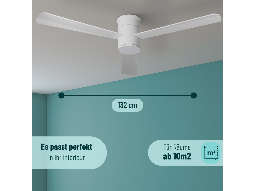 Mit einem Durchmesser von 132 cm und einem Luftstrom von bis zu 191 m3/min ist der Deckenventilator für Räume ab 10 m2 geeignet und Sie werden auch die unverzichtbare Rücklauffunktion zu schätzen wissen, die Ihnen im Winter Heizkosten spart.