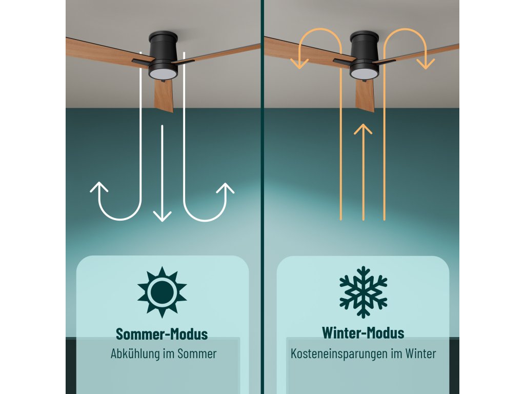 Im Winter sollten Deckenventilatoren langsam im Uhrzeigersinn drehen. Dadurch wird kalte Luft von unten angesaugt und gleichzeitig aufsteigende warme Luft an den Wänden entlang Richtung Boden gedrückt. Durch sanfte Zirkulation werden die Luftschichten vermischt und die Temperatur im gesamten Raum ausgeglichen, jedoch ohne Zugluft. Stellen Sie die Heizung also statt auf 24 °C auf 18 °C ein und sparen Sie bis zu 20 % Heizkosten.