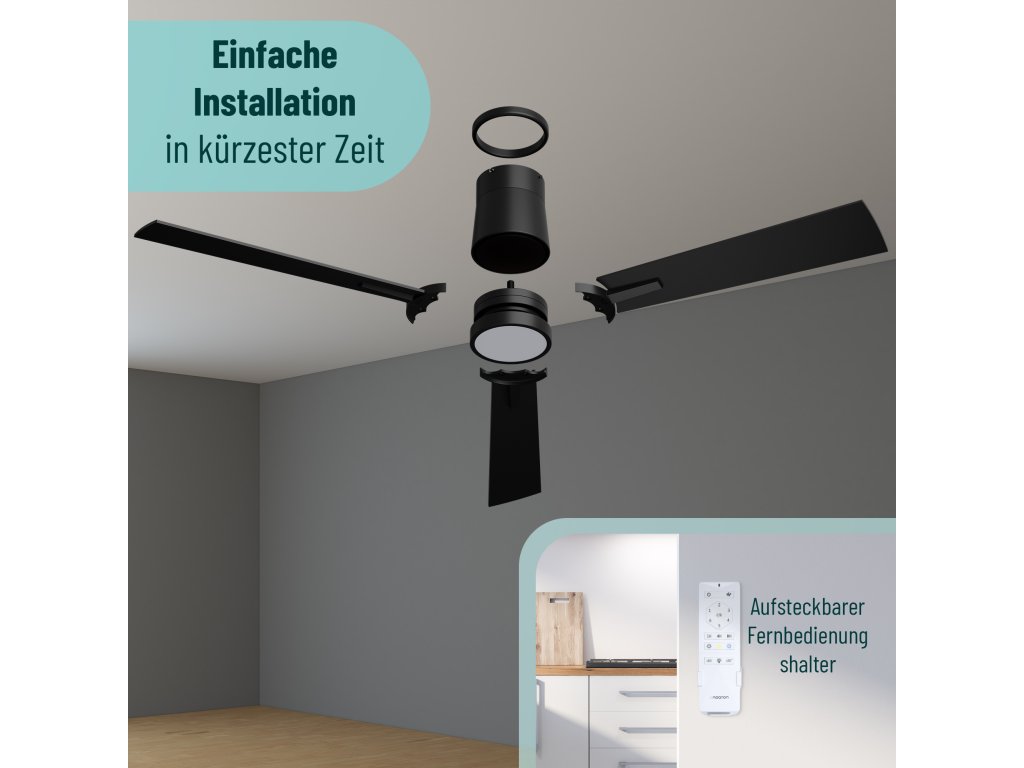 Dabei befestigen Sie den Ventilator mit Schrauben und Dübeln an der Decke (oder Wand) und schließen ihn direkt an das hauseigene Stromnetz an. Dadurch wird dem Gerät die Energie zugeführt, die es zum Betrieb benötigt. Weitere Informationen zur Montage finden Sie selbstverständlich in der Anleitung.