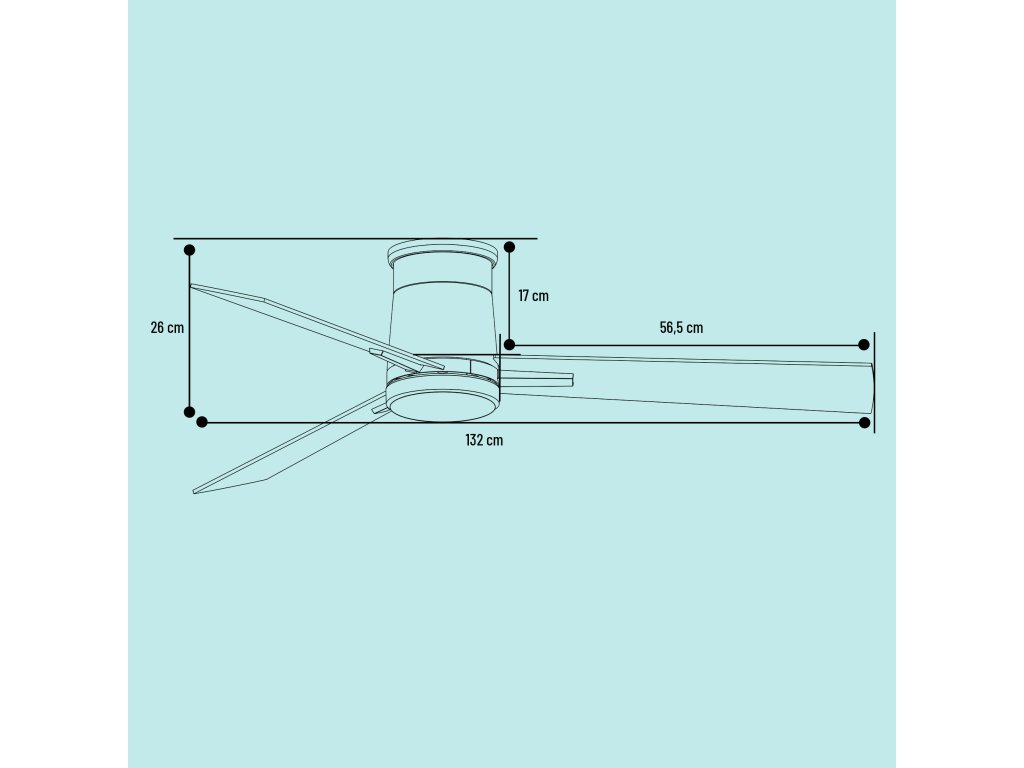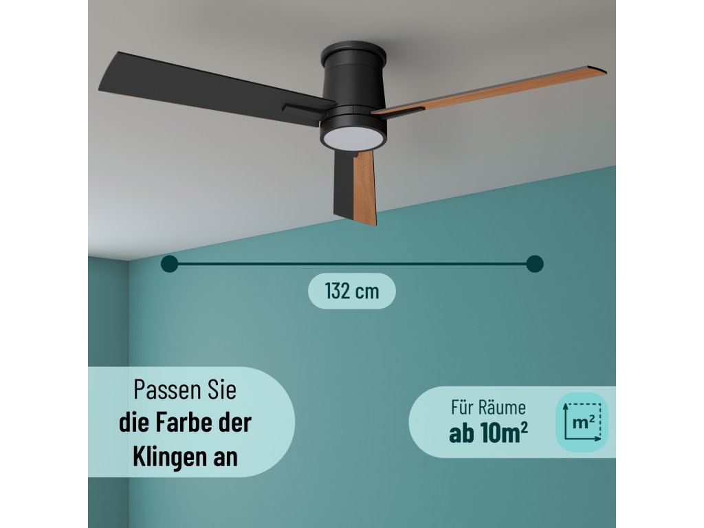 Mit einem Durchmesser von 132 cm und einem Luftstrom von bis zu 169 m3/min ist der Deckenventilator für Räume ab 10 m2 geeignet und Sie werden auch die unverzichtbare Rücklauffunktion zu schätzen wissen, die Ihnen im Winter Heizkosten spart.