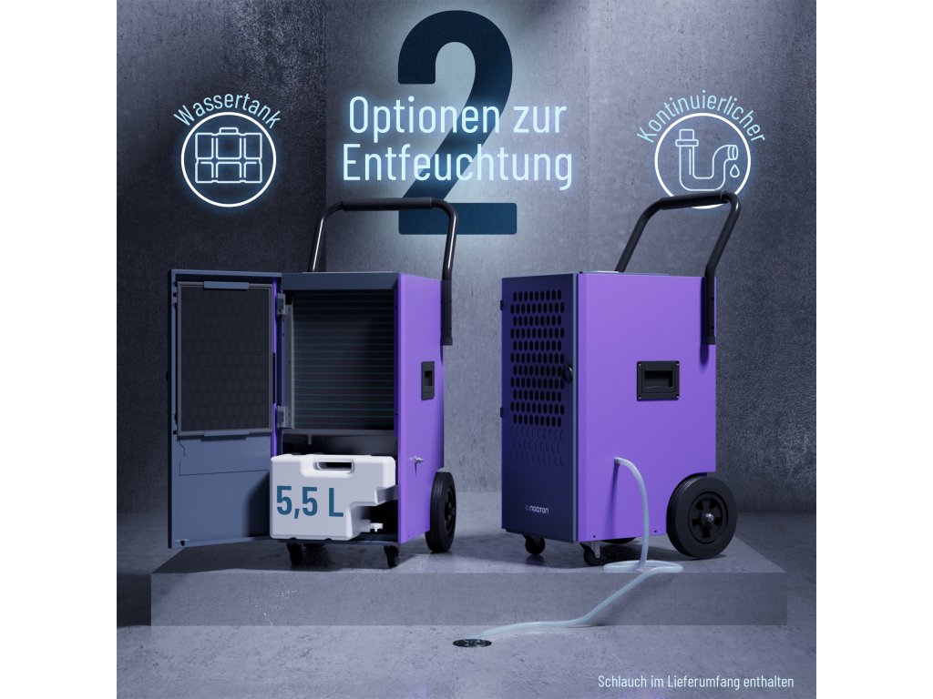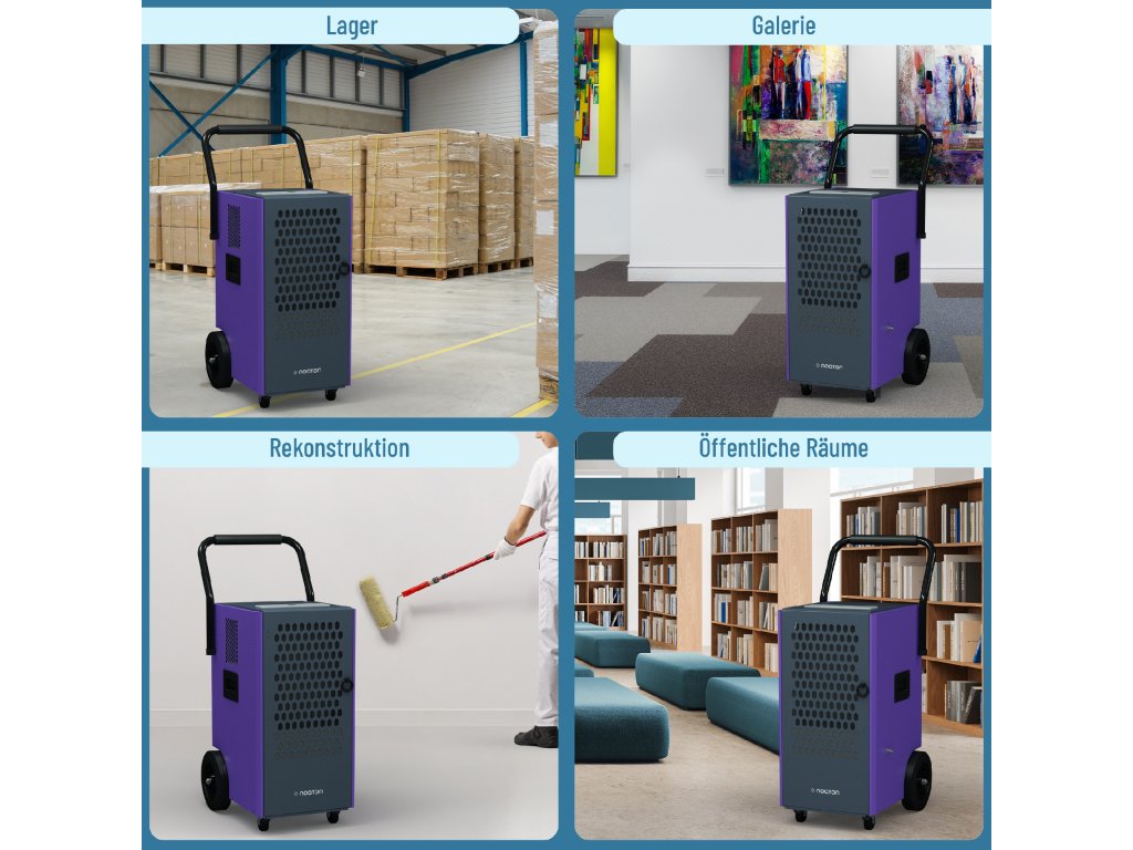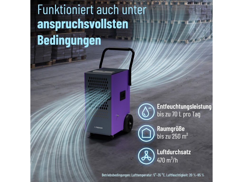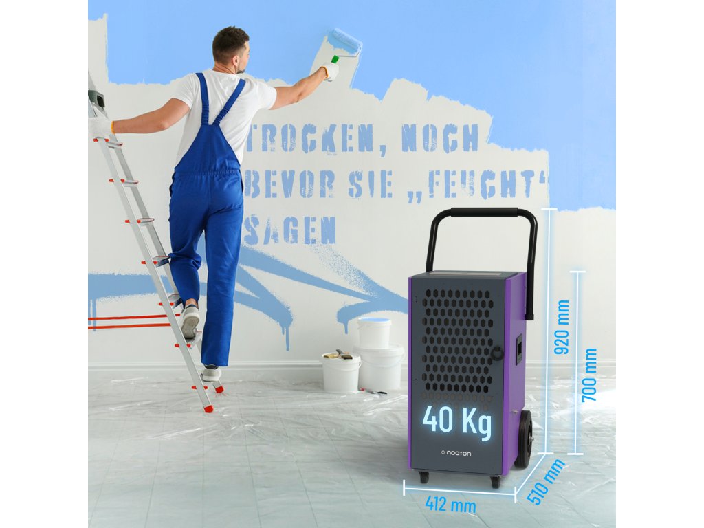 Der Noaton DF 4170 arbeitet mit Kompressortechnologie und garantiert Ihnen eine Entfeuchtungsleistung von bis zu 70 l in 24 Stunden (bei 30 °C und 80 % rF). Sein maximaler Energieverbrauch beträgt 759 W (bei 27 °C und 60 % rF). In der Praxis wird dieser industrielle Luftentfeuchter am häufigsten zum Trocknen feuchter Wände eingesetzt, wo aufgrund der hohen Luftfeuchtigkeit in Räumen wie Baustellen, Galerien, Kellern, Industriehallen, Lagerräumen und anderen Räumen mit einer Mindestgröße von 13 m² die Gefahr von Schimmelbildung oder anderen Problemen besteht.