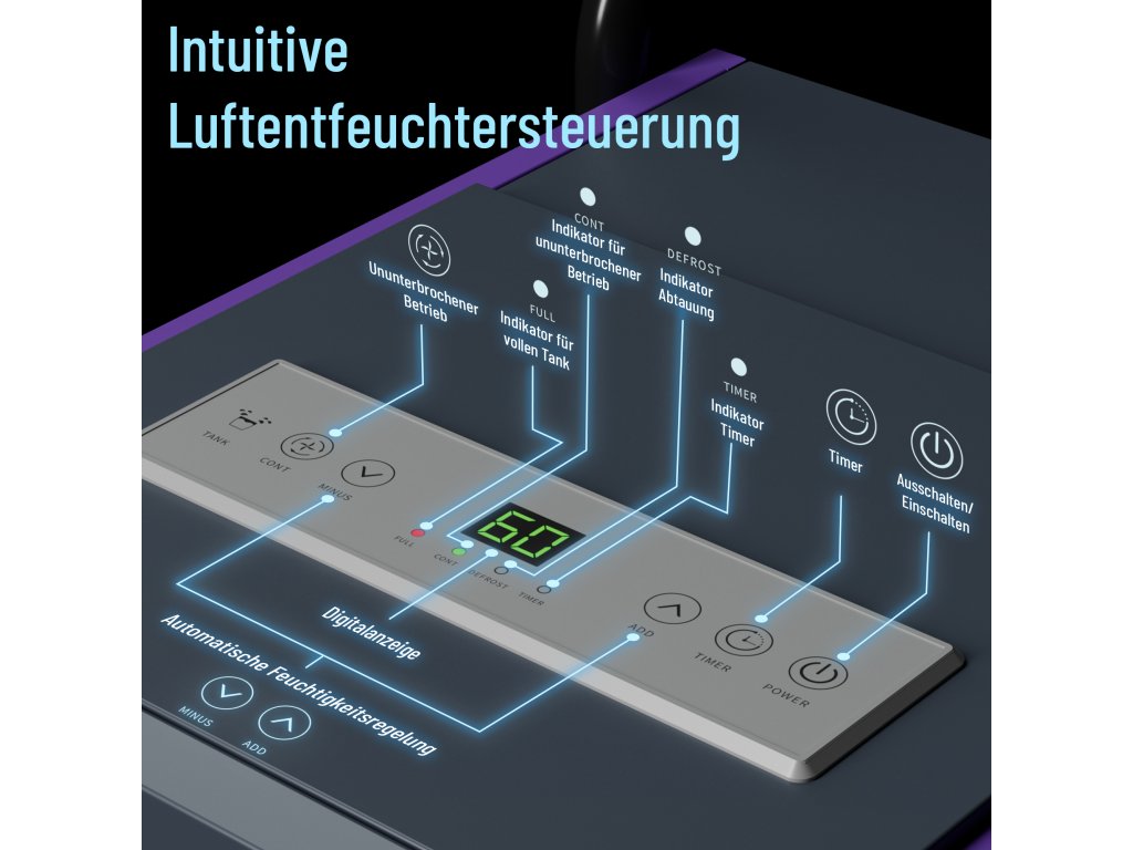 Zu den nützlichen Funktionen gehört beispielsweise ein einstellbarer Timer (1–24 Stunden) mit Startverzögerung und automatischer Abschaltung, dank dem Sie das Gerät bedenkenlos laufen lassen oder mit Startverzögerung einschalten können, wenn Sie gerade nicht in der Nähe sind. Darüber hinaus ist das Gerät mit einem Hygrostat ausgestattet, der die Luftfeuchtigkeit automatisch zwischen 20 % und 95 % hält. Die gewünschte Luftfeuchtigkeit können Sie ganz einfach über das intuitive Display einstellen, das den aktuellen Feuchtigkeitswert im Raum anzeigt.