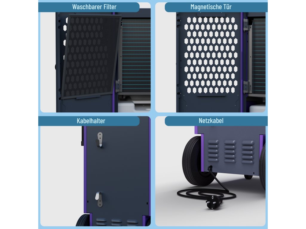 Mit einem Gewicht von 40 kg und Abmessungen von 412 x 510 x 920 mm (einschließlich Griff) mag der Luftentfeuchter schwerfällig und kompliziert in der Handhabung erscheinen. Dank seiner durchdachten Konstruktion mit Stahlgriff, Gummirädern und Bremsrollen ist er jedoch sehr bequem und einfach zu handhaben. Der Noaton DF 4170 ist außerdem mit einer magnetischen Tür ausgestattet, die ein selbstständiges Öffnen verhindert, sowie mit einer Halterung für das Netzkabel.